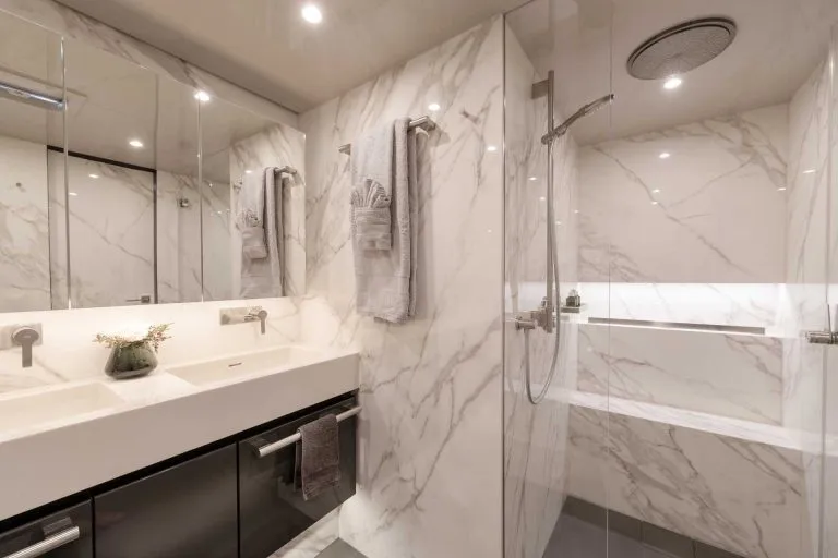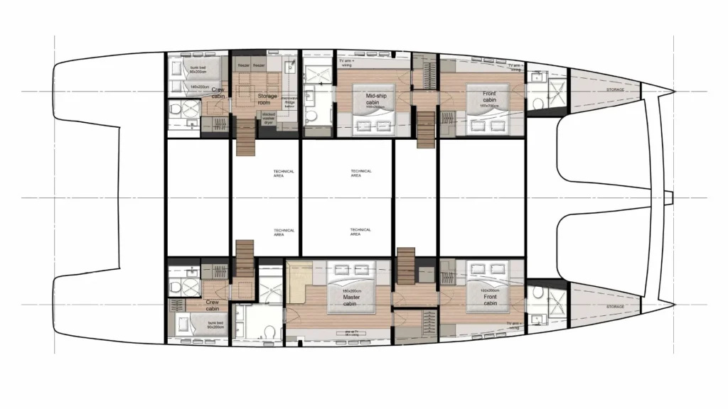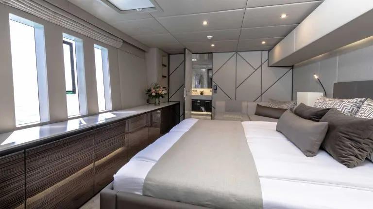 Her interior showcases four beautifully appointed guest cabins, including a master suite with its own lounge, dressing area, and ensuite bathroom and three guest en-suites. Two crew cabins provide professional accommodations, while a dedicated storage room, a rare commodity on yachts of this size, adds a level of convenience that makes extended voyages effortless.