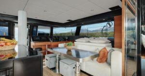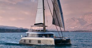 Her galley-up configuration creates a seamless connection between the saloon and cockpit, ideal for socialising and entertaining. The main saloon features a spacious galley with extended island, wine cooler, and pop-up TV, and a comfortable starboard lounge area with a modular, height-adjustable dining table. Accommodation is eight guests overnight in four en-suit cabins. Located in the starboard hull is the Owner’s suite with walk-in dressing area and generous private bathroom. In the port hull is the VIP cabin with an office space. There are two additional guest cabins offering comfort and versatility.