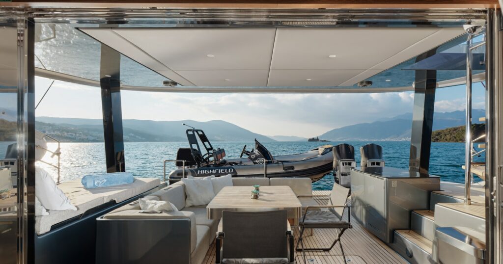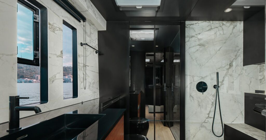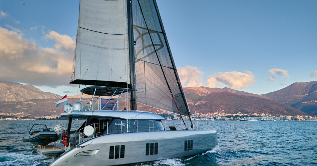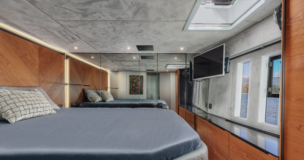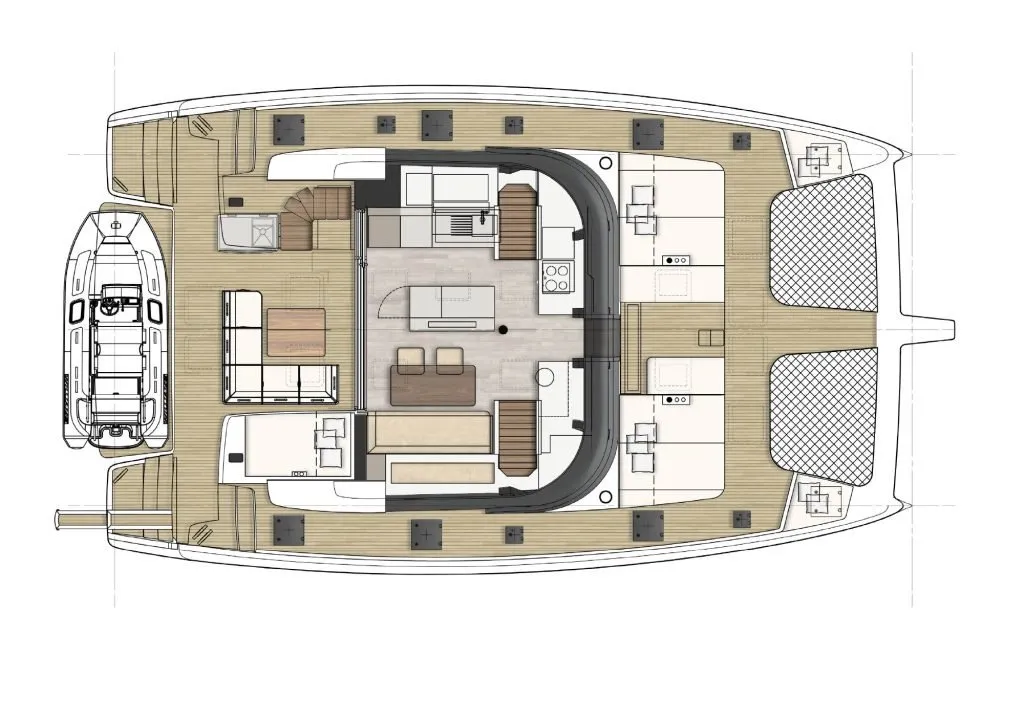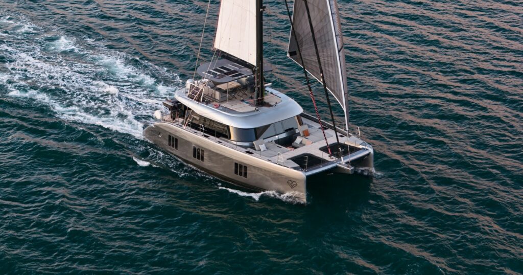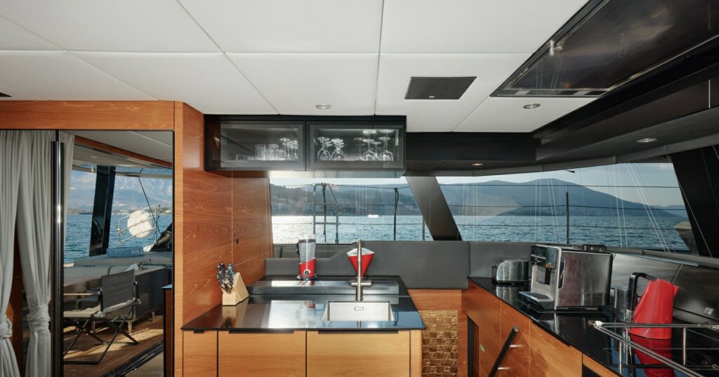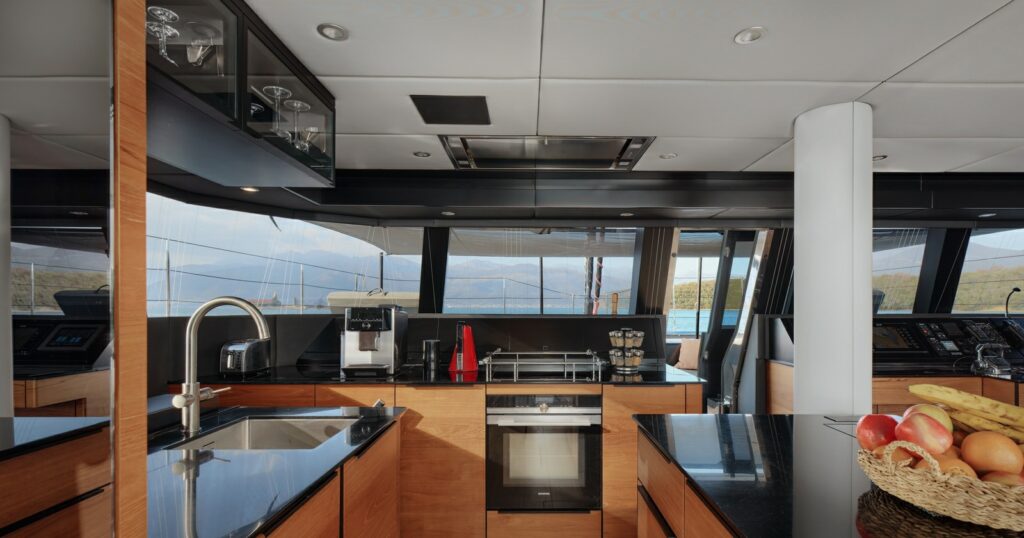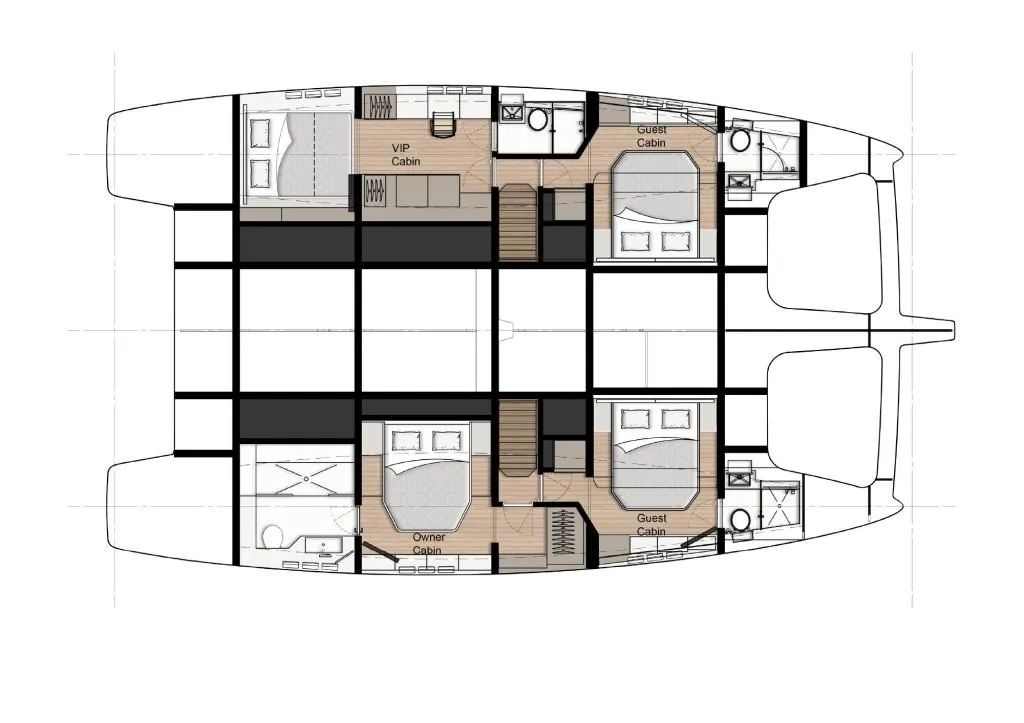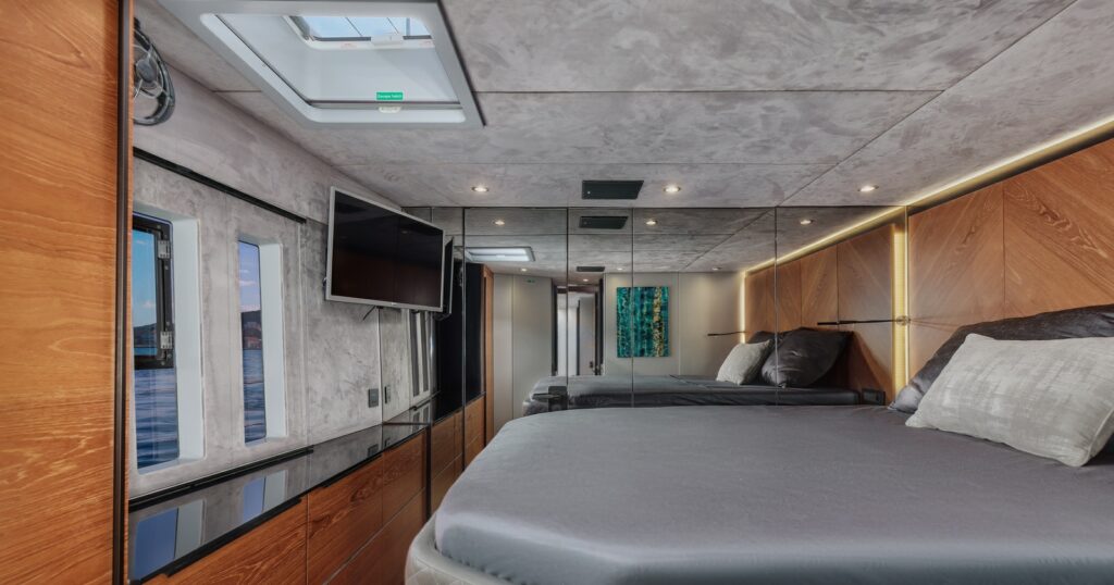 Her galley-up configuration creates a seamless connection between the saloon and cockpit, ideal for socialising and entertaining. The main saloon features a spacious galley with extended island, wine cooler, and pop-up TV, and a comfortable starboard lounge area with a modular, height-adjustable dining table. Accommodation is eight guests overnight in four en-suit cabins. Located in the starboard hull is the Owner’s suite with walk-in dressing area and generous private bathroom. In the port hull is the VIP cabin with an office space. There are two additional guest cabins offering comfort and versatility.