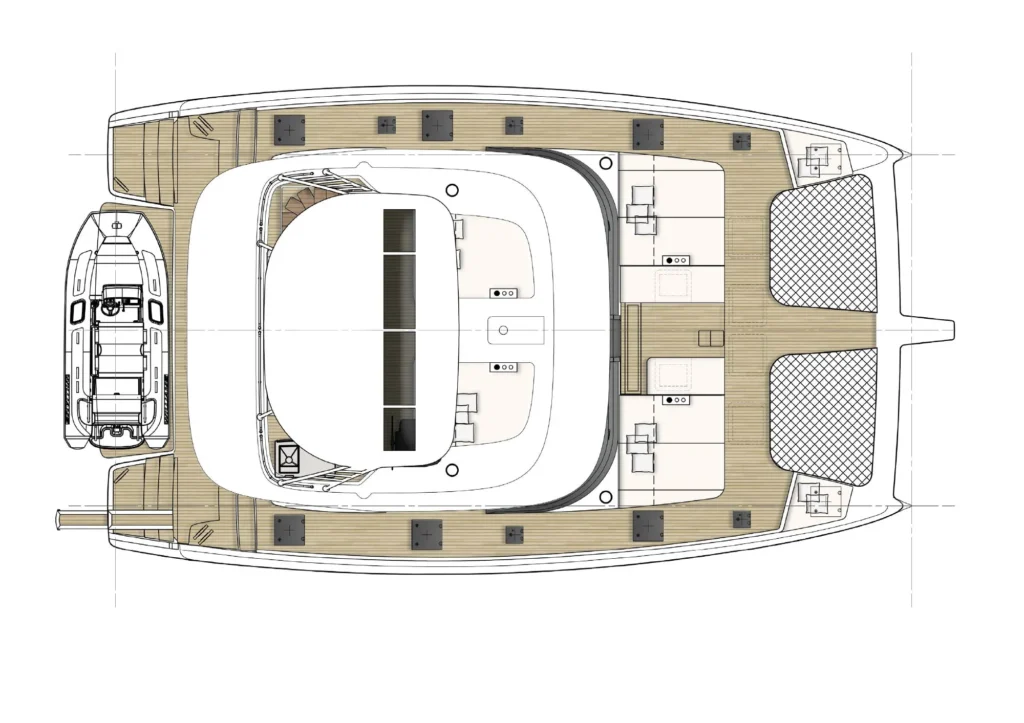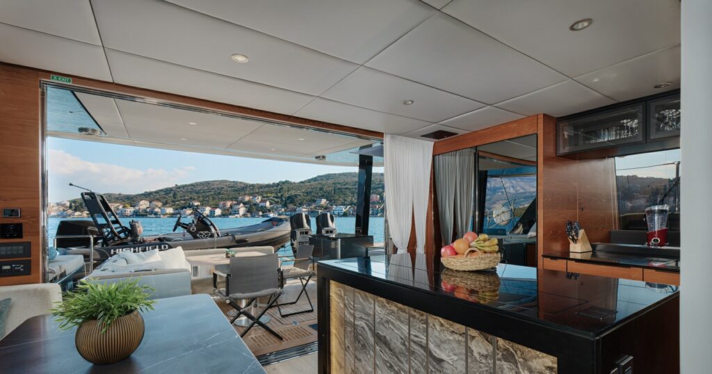 The Sunreef 50’s renowned exterior design provides exceptional living and lounging areas across her decks. The full-bean aft cockpit, features an L-shaped sofa, wet bar, and height-adjustable dining table. The hydraulic platform extends the lounging area and serves as a tender lift or beach club extension. Moving towards the foredeck, are the spacious trampolines and seating area for sunbathing and enjoying ocean views. On the flybridge a dedicated to outdoor living is equipped with a large dining table, BBQ bar, and expansive sunpads for relaxing under sail or at anchor.