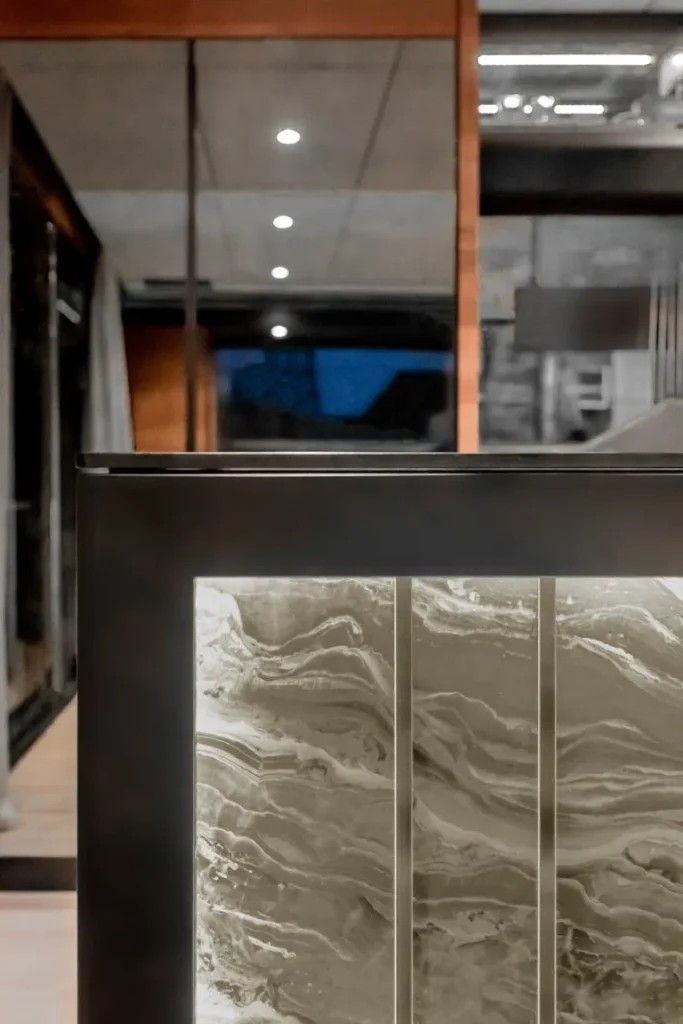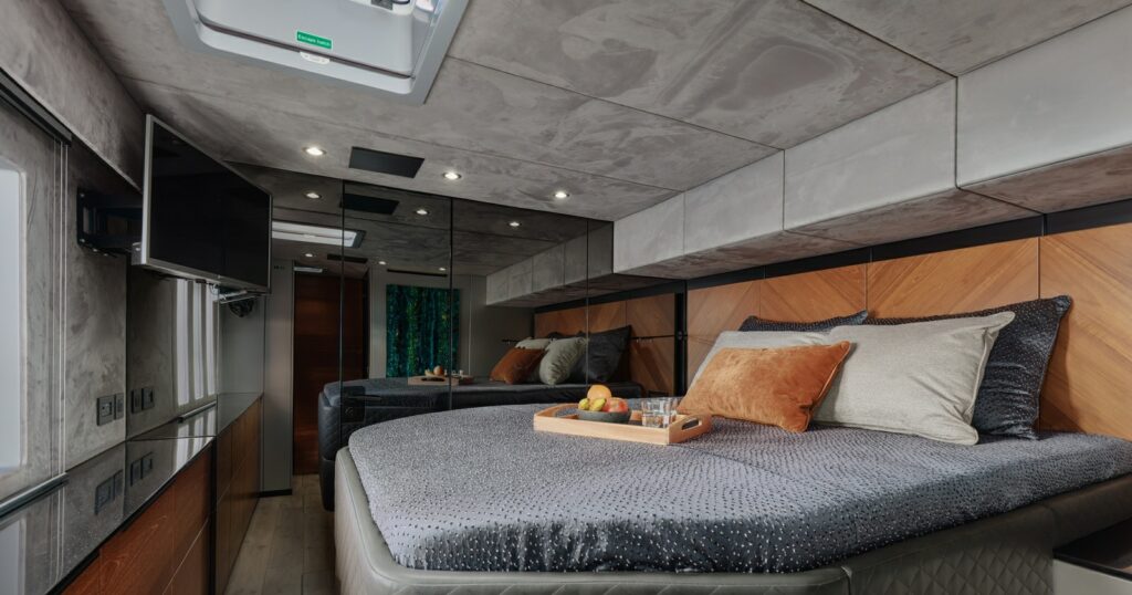 Blending contemporary design with intelligent functionality, LUCY’s interior has been custom-finished with premium materials inspired by the luxury automotive world — featuring Alcantara-style fabrics, brushed steel, and natural wood veneers.